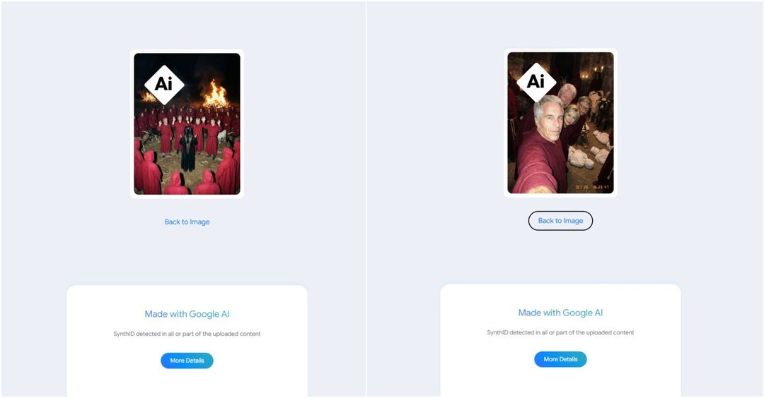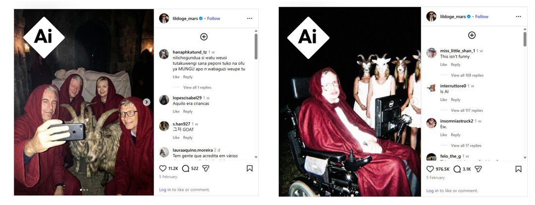 Αφού το Υπουργείο Δικαιοσύνης των ΗΠΑ δημοσίευσε τον Ιανουάριο του 2026 μια νέα σειρά εγγράφων που σχετίζονται με την έρευνα για τον εκλιπόντα καταδικασμένο για σεξουαλικά εγκλήματα Τζέφρι Έπσταϊν, ψευδείς ισχυρισμοί διαδόθηκαν στο διαδίκτυο σε πολλές γλώσσες, συχνά με τη χρήση κατασκευασμένων ή παραποιημένων εικόνων. Το τελευταίο παράδειγμα στα ελληνικά ήταν η κυκλοφορία τεσσάρων εικόνων που έδειχναν τον Έπσταϊν με τον Μπιλ Γκέιτς, τον Στίβεν Χόκινγκ, τον Μπιλ Κλίντον και τη Χίλαρι Κλίντον να συμμετέχουν σε τελετουργίες στο νησί του Έπσταϊν, υποτίθεται ως απόδειξη των δεσμών τους μαζί του. Μια ανάλυση του AFP διαπίστωσε ότι οι εικόνες δημιουργήθηκαν με τεχνητή νοημοσύνη (AI) και έφεραν ένα υδατογράφημα AI.