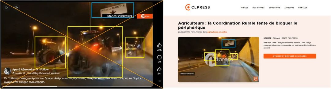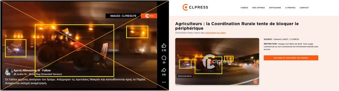 Στο πλαίσιο αυτό, Έλληνες χρήστες του Facebook άρχισαν να κοινοποιούν βίντεο, είτε δημιουργημένα με τεχνητή νοημοσύνη είτε παλιά, που υποτίθεται ότι δείχνουν Γάλλους αγρότες να διαδηλώνουν και να οδεύουν προς σύγκρουση με τις αρχές. Το πιο πρόσφατο τέτοιο απόσπασμα διαρκεί 22 δευτερόλεπτα και δείχνει μια μεγάλη σειρά από τρακτέρ τα οποία κινούνται σε έναν αυτοκινητόδρομο κατά τη διάρκεια της νύχτας.