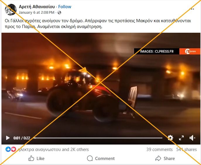 «Οι Γάλλοι αγρότες ανοίγουν τον δρόμο. Απέρριψαν τις προτάσεις Μακρόν και κατευθύνονται προς το Παρίσι. Αναμένεται σκληρή αναμέτρηση», αναφέρει αυτή η ανάρτηση στο Facebook από τις 6 Ιανουαρίου, η οποία περιλαμβάνει το βίντεο και έχει κοινοποιηθεί από τότε περισσότερες από 500 φορές.