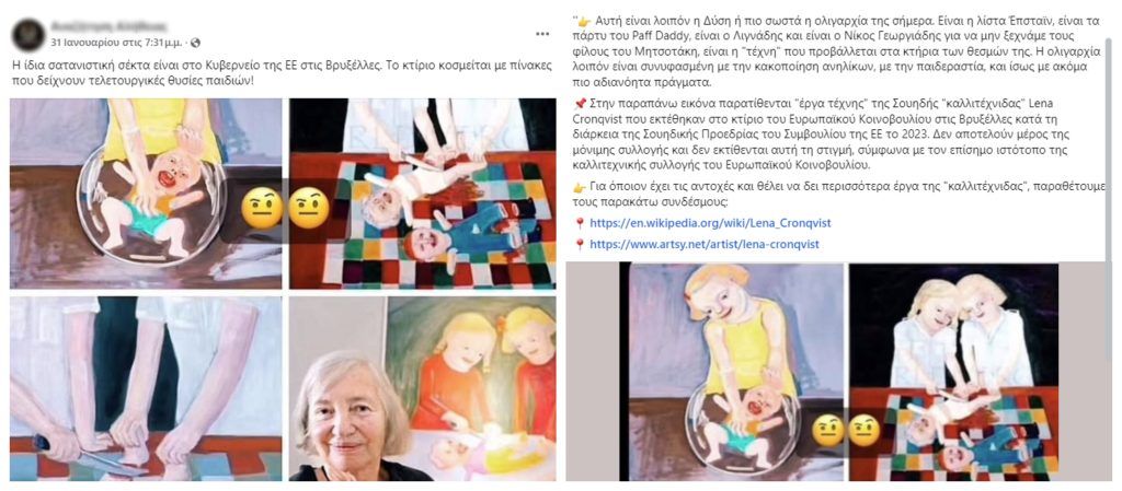 Στα τέλη Ιανουαρίου 2026 κυκλοφόρησε ευρέως σε μέσα κοινωνικής δικτύωσης και ιστολόγια ο ισχυρισμός ότι τέσσερις πίνακες της Σουηδής καλλιτέχνιδας Lena Cronqvist, οι οποίοι υποτίθεται πως παρουσιάζουν θυσίες παιδιών, εκτίθενται σε χώρους του Ευρωπαϊκού Κοινοβουλίου. «Το κτίριο κοσμείται με πίνακες που δείχνουν τελετουργικές θυσίες παιδιών», διαβάζουμε χαρακτηριστικά σε ορισμένες αναρτήσεις. Σε κάποια δημοσιεύματα αναφέρεται ότι οι εξεταζόμενοι πίνακες εκτίθενται επί του παρόντος στο κτήριο του Ευρωπαϊκού Κοινοβουλίου, στις Βρυξέλλες, ενώ σε άλλα υποστηρίζεται ότι αυτοί είχαν εκτεθεί στο ίδιο κτήριο το 2023, σε πλαίσιο προσωρινής έκθεσης.
