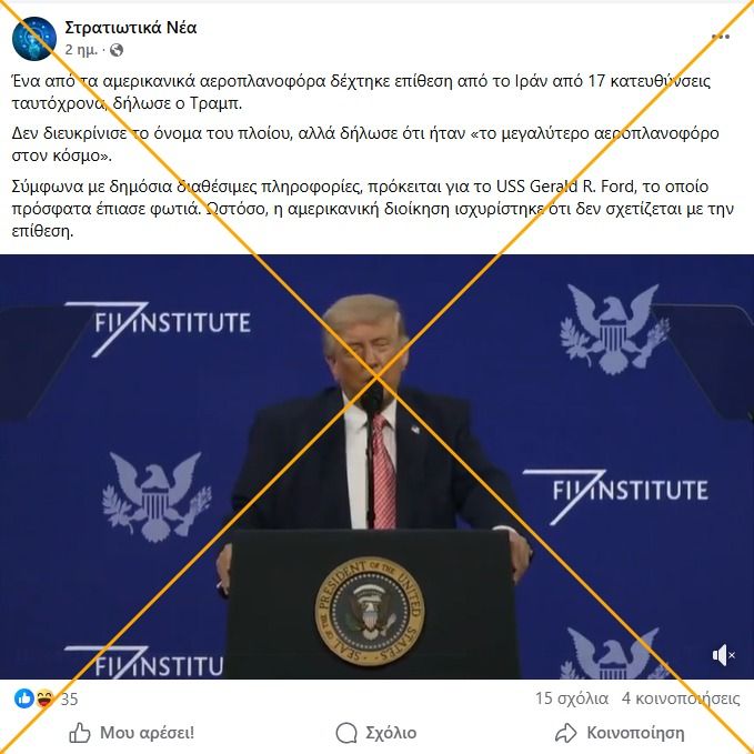 «Σύμφωνα με δημόσια διαθέσιμες πληροφορίες, πρόκειται για το USS Gerald R. Ford, το οποίο πρόσφατα έπιασε φωτιά. Ωστόσο, η αμερικανική διοίκηση ισχυρίστηκε ότι δεν σχετίζεται με την επίθεση», συνεχίζει η ανάρτηση. Η ανάρτηση συγκέντρωσε περισσότερες από 7.000 προβολές σε πλατφόρμες όπως το Facebook, το Instagram και το Threads.