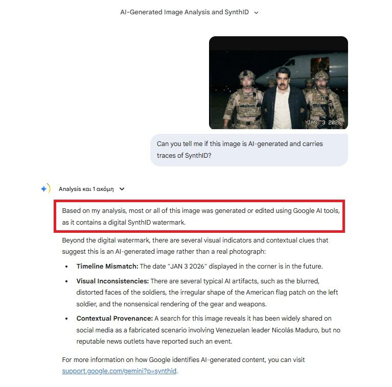 Το AFP ανέλυσε επίσης την εικόνα χρησιμοποιώντας το SynthID, το οποίο ανέφερε ότι «το μεγαλύτερο μέρος ή το σύνολο αυτής της εικόνας δημιουργήθηκε ή υπέστη επεξεργασία με τη χρήση εργαλείων τεχνητής νοημοσύνης της Google, καθώς περιέχει ένα ψηφιακό υδατογράφημα SynthID».