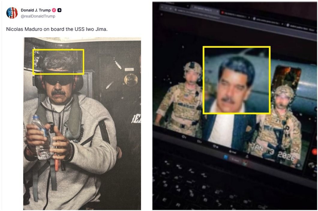 Στη φωτογραφία που κοινοποίησε ο Τραμπ, ο Μαδούρο φαίνεται μεγαλύτερος σε ηλικία, με πιο γκρίζα μαλλιά σε σύγκριση με τα πιο σκούρα μαλλιά που φαίνονται στην ψευδώς κοινοποιημένη εικόνα.