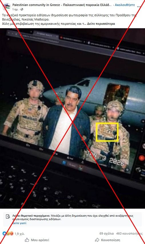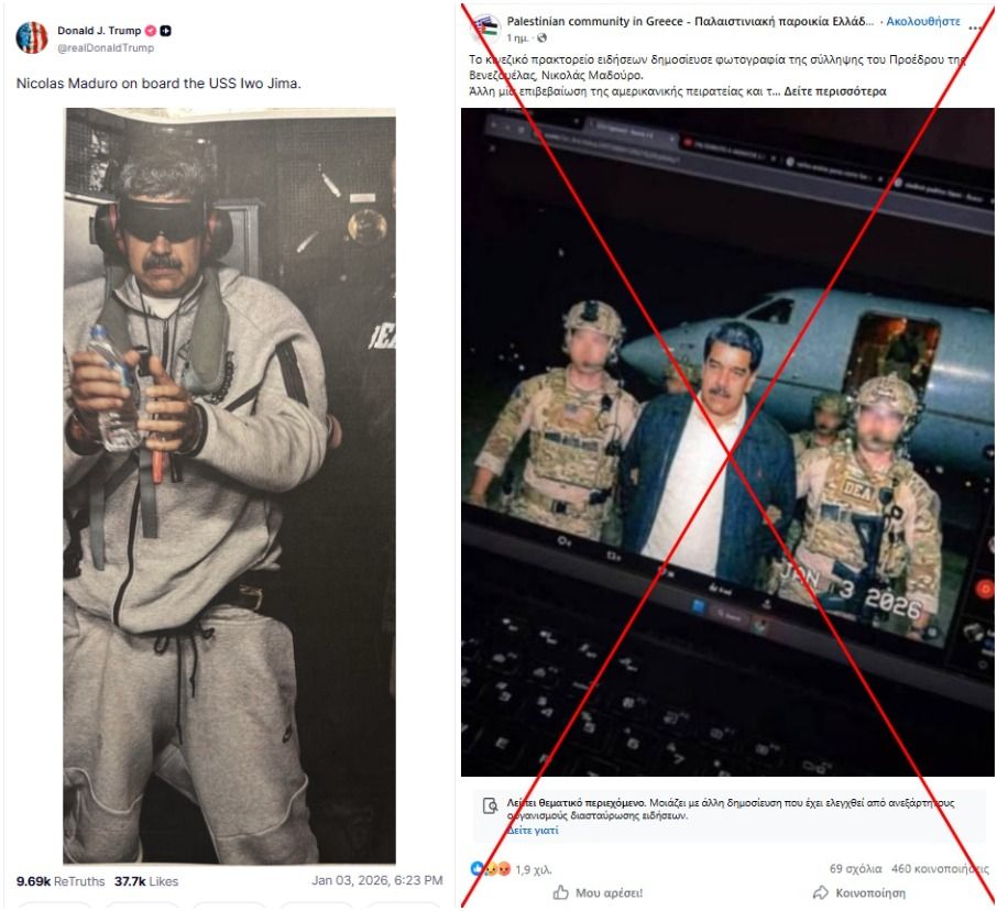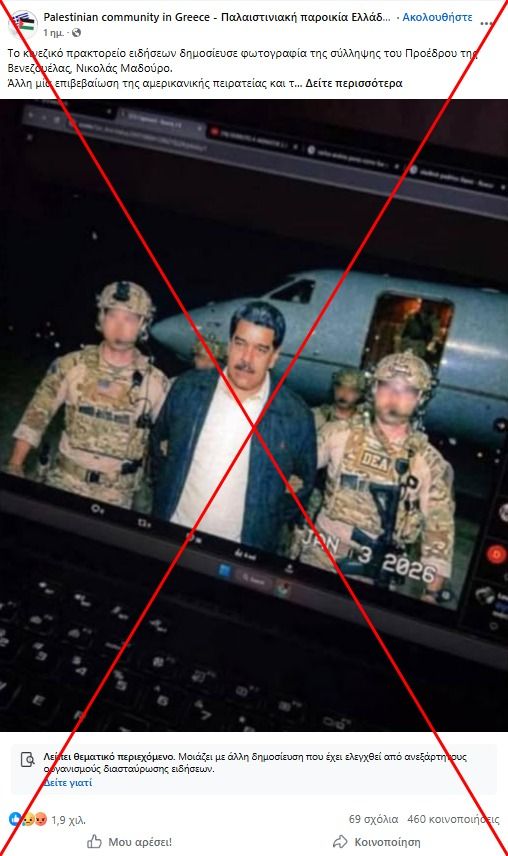 «Το κινεζικό πρακτορείο ειδήσεων δημοσίευσε φωτογραφία της σύλληψης του Προέδρου της Βενεζουέλας, Νικολάς Μαδούρο», γράφει η περιγραφή σε αυτή την ανάρτηση στο Facebook από τις 3 Ιανουαρίου 2026, η οποία περιλαμβάνει μια εικόνα που δείχνει τον Μαδούρο να κρατείται από δύο στρατιώτες. Η ανάρτηση έχει έκτοτε κοινοποιηθεί περισσότερες από 450 φορές.