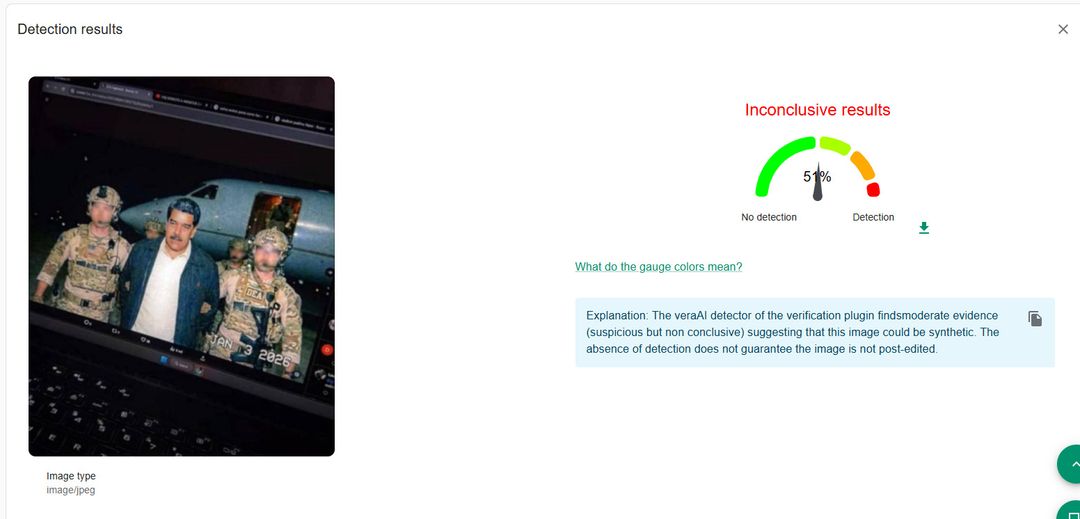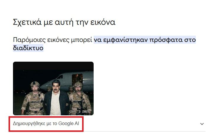 Ο καθαιρεθείς πρόεδρος της Βενεζουέλας, Νικολάς Μαδούρο, και η σύζυγός του, Σίλια Φλόρες, συνελήφθησαν από τις ειδικές δυνάμεις των ΗΠΑ τις πρώτες πρωινές ώρες της 3ης Ιανουαρίου 2026, εν μέσω βομβαρδισμών που αιφνιδίασαν τους κατοίκους της πρωτεύουσας Καράκας. Λίγες ώρες αργότερα, μια εικόνα που αποδόθηκε ψευδώς στην επιχείρηση και έγινε viral στα μέσα κοινωνικής δικτύωσης σε πολλές γλώσσες, συμπεριλαμβανομένων των ελληνικών, υποτίθεται ότι έδειχνε τη σύλληψη του Μαδούρο. Ωστόσο, η εικόνα δεν είναι γνήσια. Το AFP διαπίστωσε ότι δημιουργήθηκε με τεχνητή νοημοσύνη (AI), όπως αποδεικνύεται από οπτικές ασυνέπειες και εργαλεία ανίχνευσης AI.
