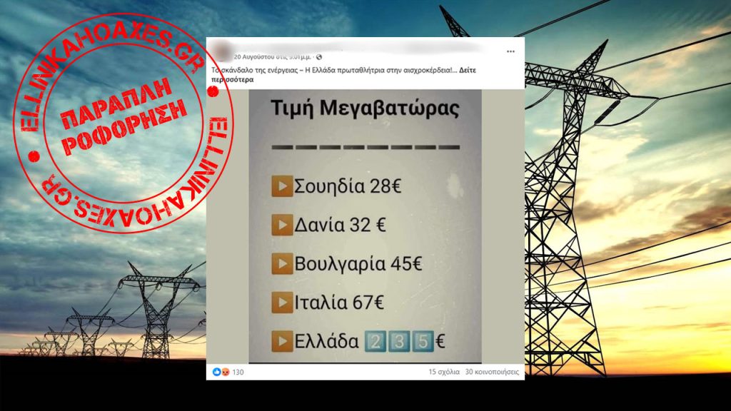 Ανακύκλωση παραπλανητικού ισχυρισμού για τις τιμές της ηλεκτρικής ενέργειας σε χώρες της Ευρώπης