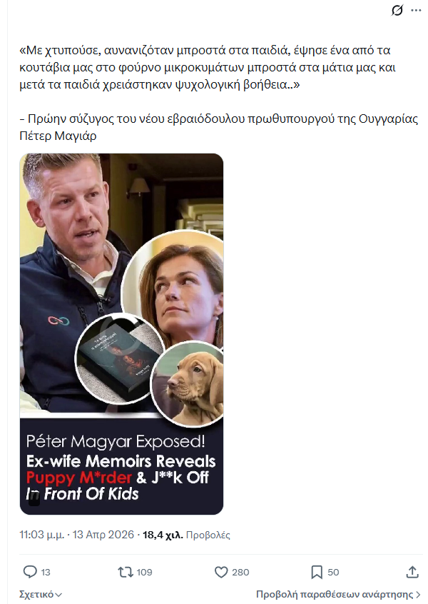 Στα μέσα Απριλίου του 2026, το πολιτικό σκηνικό στην Ουγγαρία άλλαξε καθώς ο Péter Magyar κέρδισε την μάχη της κάλπης και διαδέχθηκε τον Βίκτορ Όρμπαν που θήτευσε ως πρωθυπουργός επί 16 συναπτά έτη. Στο πλαίσιο της εκλογής του νέου πρωθυπουργού, ένας ψευδής ισχυρισμός έκανε την εμφάνισή του διεθνώς, φτάνοντας και στη χώρα μας, θίγοντας την προσωπική ζωή του.