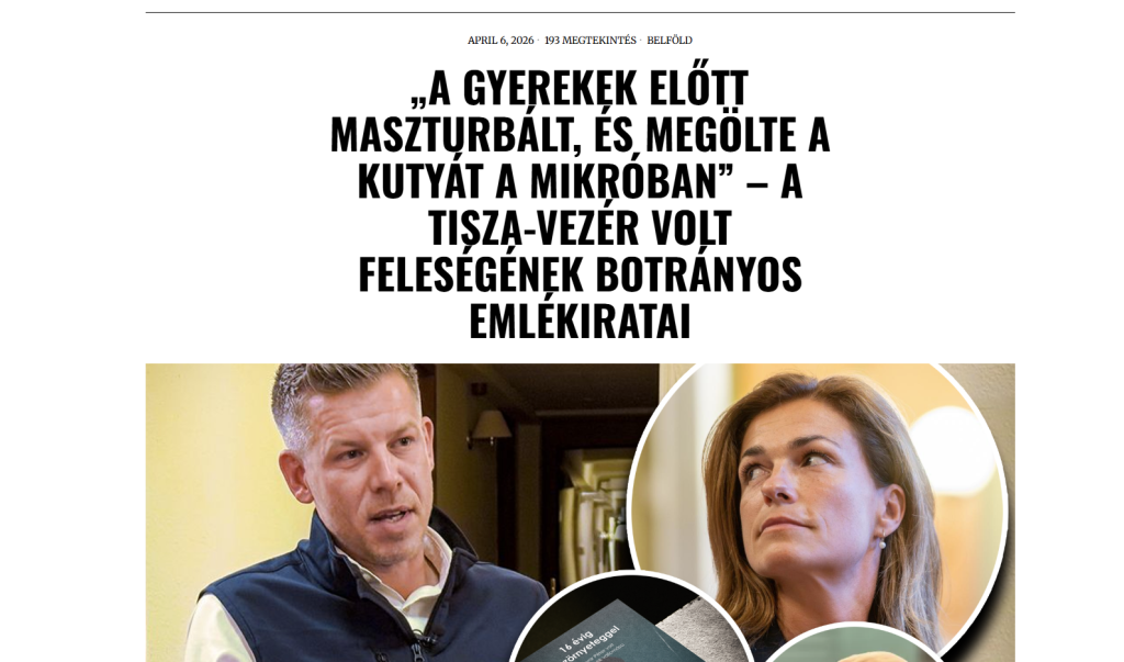 Στα τέλη Μαρτίου 2026, δημοσιεύθηκαν τα απομνημονεύματα της Judit Varga, πρώην συζύγου του Péter Magyar, ηγέτη του κόμματος της αντιπολίτευσης Tisza, με τίτλο «16 χρόνια με το Τέρας — Η εξομολόγηση της πρώην συζύγου του Péter Magyar». Στο βιβλίο, περιγράφει λεπτομερώς την κοινή τους ζωή. Σύμφωνα με τη συγγραφέα, ο Péter Magyar υπέφερε από σοβαρό εθισμό στο αλκοόλ για χρόνια. Σύμφωνα με την αφήγηση της Varga, σε κατάσταση σοβαρής μέθης έχανε τακτικά τον αυτοέλεγχο: γδυνόταν εντελώς μπροστά στα παιδιά και αυνανιζόταν μπροστά τους. Τον Μάρτιο του 2023, κατά τη διάρκεια μιας άλλης υπερβολικής κατανάλωσης αλκοόλ, ο Péter Magyar άρπαξε ένα από τα ουγγρικά κουτάβια Vizsla της οικογένειας και το μαγείρεψε ζωντανό στον φούρνο μικροκυμάτων. Το ζώο πέθανε μπροστά στα μάτια της μητέρας και των τριών παιδιών τους. Μια φωτογραφία του νεκρού κουταβιού εμφανίστηκε στα απομνημονεύματα. Μετά την τραγωδία, και τα τρία παιδιά χρειάστηκαν μακροχρόνια ψυχολογική υποστήριξη και η Judit Varga αποφάσισε να διακόψει κάθε επαφή με τον Péter Magyar. Τα απομνημονεύματα έχουν ήδη προκαλέσει εκτεταμένες αντιδράσεις στο κοινό. Ούτε ο Péter Magyar ούτε η ηγεσία του Κόμματος Tisza έχουν σχολιάσει τις κατηγορίες που διατυπώθηκαν.