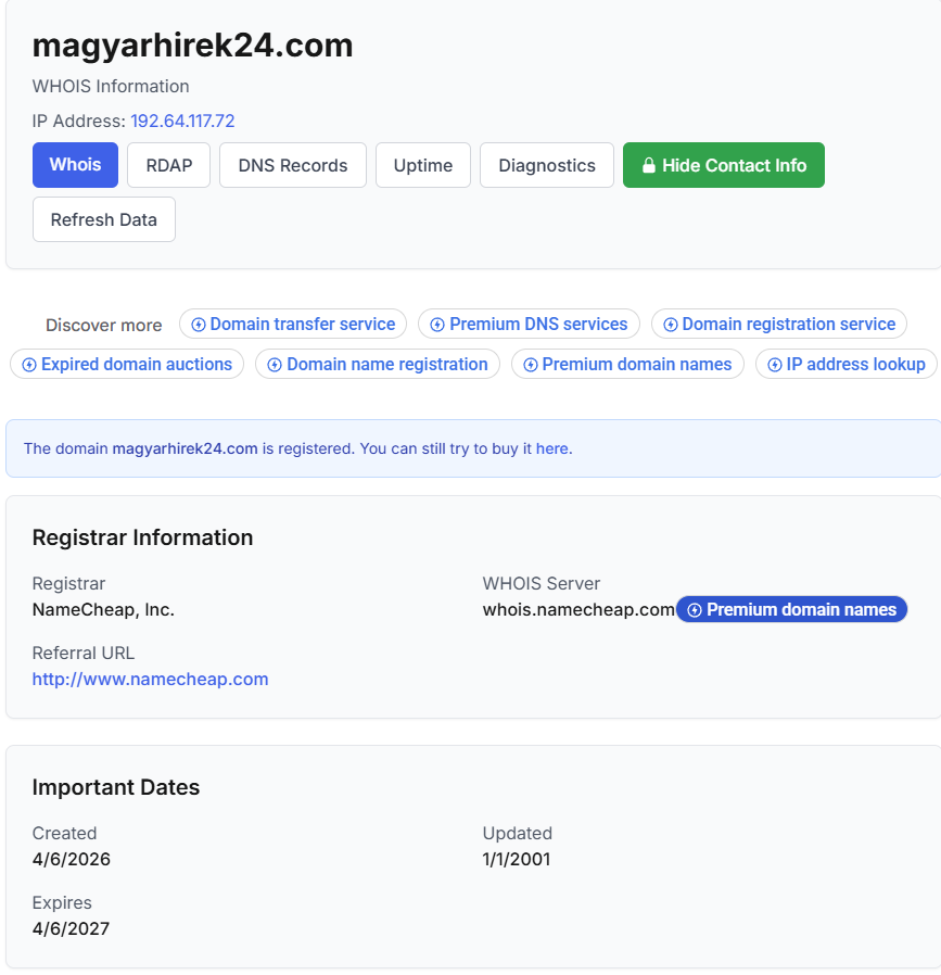 Το όνομα του αρθρογράφου, στο τέλος του κειμένου, εμφανίζεται ως “Gábor Molnár”. Αναζήτηση του ονόματός του δεν επέστρεψε κανένα αποτέλεσμα περί αρθρογραφίας του, παρά μόνο έναν Ούγγρο ποδοσφαιριστή με το ίδιο όνομα και άλλα άσχετα επαγγέλματα (εδώ, εδώ κι εδώ). Αντίστοιχα, το όνομα του domain, όπου πρωτοεμφανίστηκε ο ισχυρισμός, φαίνεται πως καταχωρήθηκε την ίδια εκείνη ημερομηνία ανάρτησης του δημοσιεύματος (6 Απριλίου) μέσω της NameCheap, Inc., μιας εταιρείας με έδρα το Ρέικιαβικ της Ισλανδίας, σύμφωνα με το εργαλείο αναζήτησης Whois.