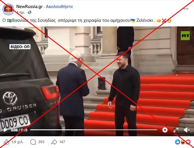 Το σουηδικό βασιλικό παλάτι διέψευσε τον ψευδή ισχυρισμό ότι ο βασιλιάς της Σουηδίας δεν είχε χαιρετήσει τον Ζελένσκι με χειραψία, σε δήλωση προς τη δημόσια ραδιοτηλεόραση της Σουηδίας SVT στις 18 Απριλίου 2026. Το δημοσίευμα κάνει αναφορά σε μια ανάρτηση στο X του ρωσικού κρατικού τηλεοπτικού φορέα Russia Today (RT). Το AFP εντόπισε το βίντεο, το οποίο είναι διαθέσιμο εδώ. Επίσης, διαπιστώσαμε ότι μέρος του λογοτύπου του RT είναι ορατό στα βίντεο που κυκλοφορούν στα μέσα κοινωνικής δικτύωσης.