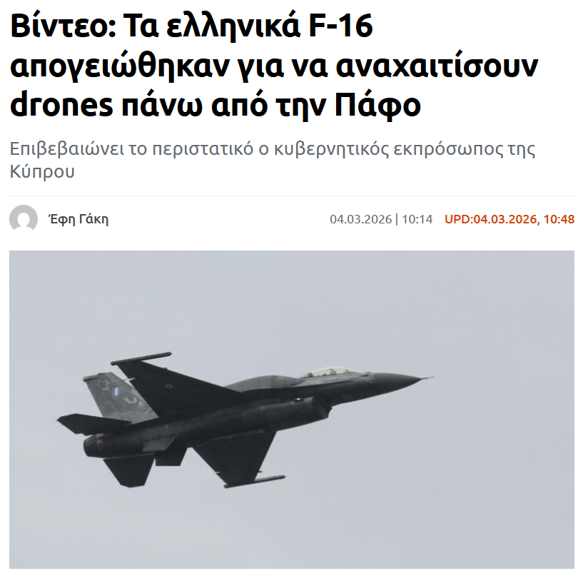 ΙΣΧΥΡΙΣΜΟΣ: Ελληνικά F-16 αναχαίτισαν drones «πάνω από την Πάφο». Ο εναέριος χώρος της Κύπρου έκλεισε λόγω της απειλής.