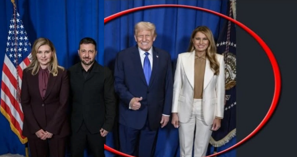 Εξετάζοντας τις υπόλοιπες φωτογραφίες που εμφανίζονται στο «κολάζ», διαπιστώνουμε πως η πρώτη φωτογραφία που έχει υποστεί περικοπή, που υποτίθεται δείχνει τον Ντόναλντ Τραμπ και τη Μελάνια Τραμπ να έχουν φωτογραφηθεί «μόνοι τους», είναι στην πραγματικότητα αυτή του ζεύγους Τράμπ με τον πρόεδρο της Ουκρανίας, Βολοντίμιρ Ζελένσκι, και τη σύζυγό του, κάτι που είναι ξεκάθαρο εφόσον ενώσουμε τις δύο αυτές εικόνες: