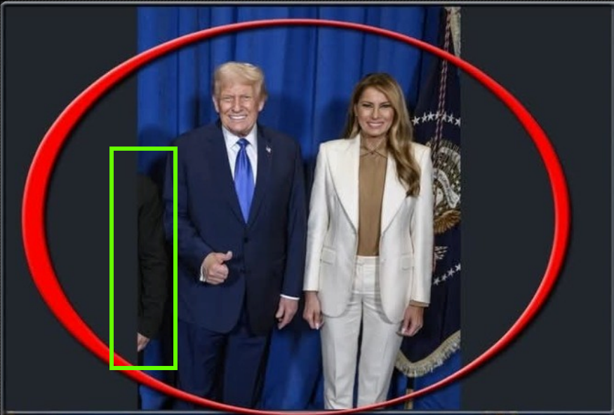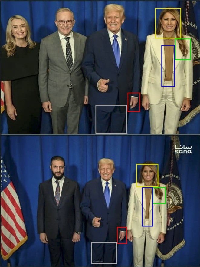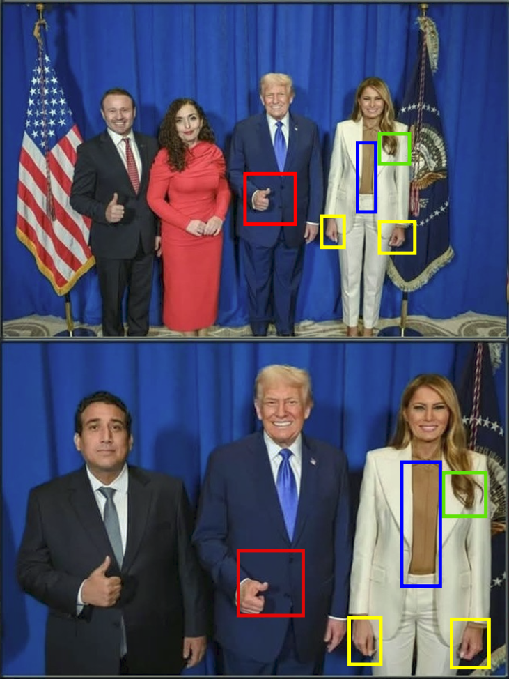Παράδειγμα 2: Εμφανείς διαφορές στο τσάκισμα του παντελονιού του Ντόναλντ Τραμπ (με γκρι επισήμανση), στο χέρι του Ντόναλντ Τραμπ (με κόκκινη επισήμανση) στη στάση του προσώπου της Μελάνια Τραμπ (με κίτρινη επισήμανση), στα μαλλιά της Μελάνια Τραμπ (με πράσινη επισήμανση) και στο σακάκι της Μελάνια Τραμπ (με μπλε επισήμανση):