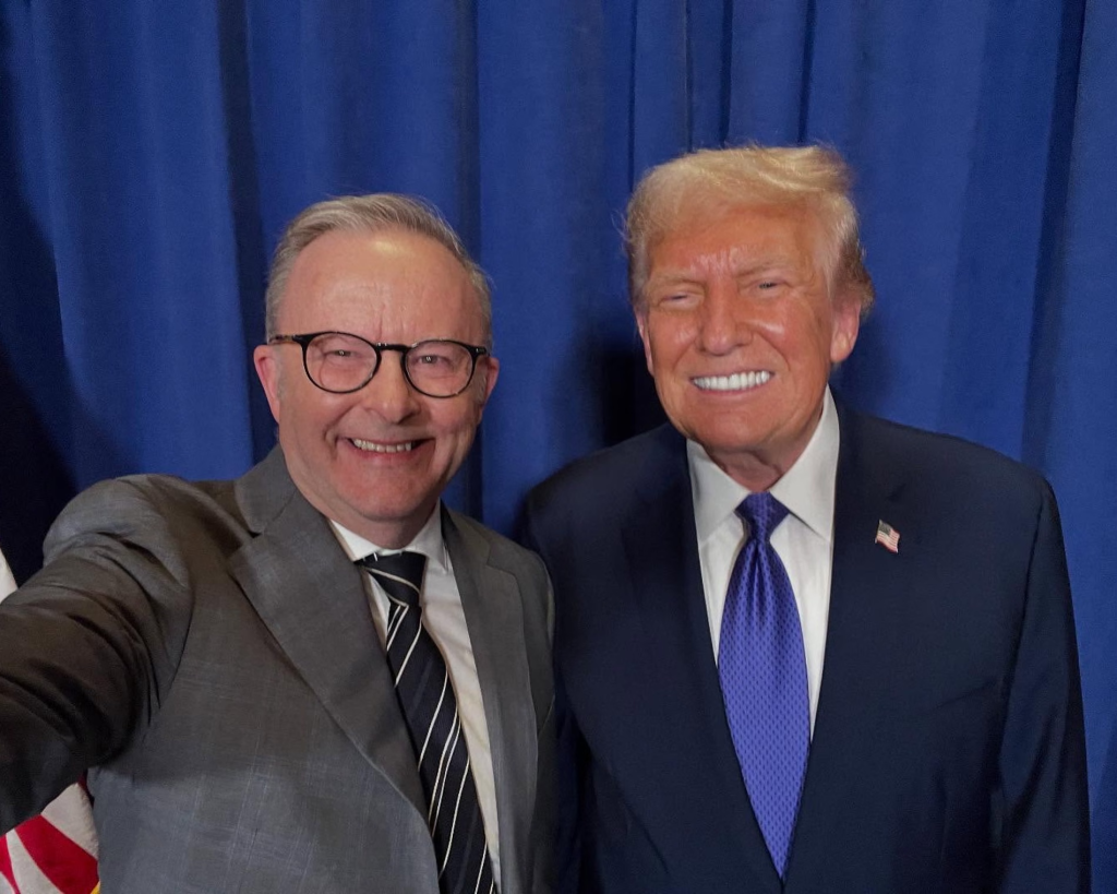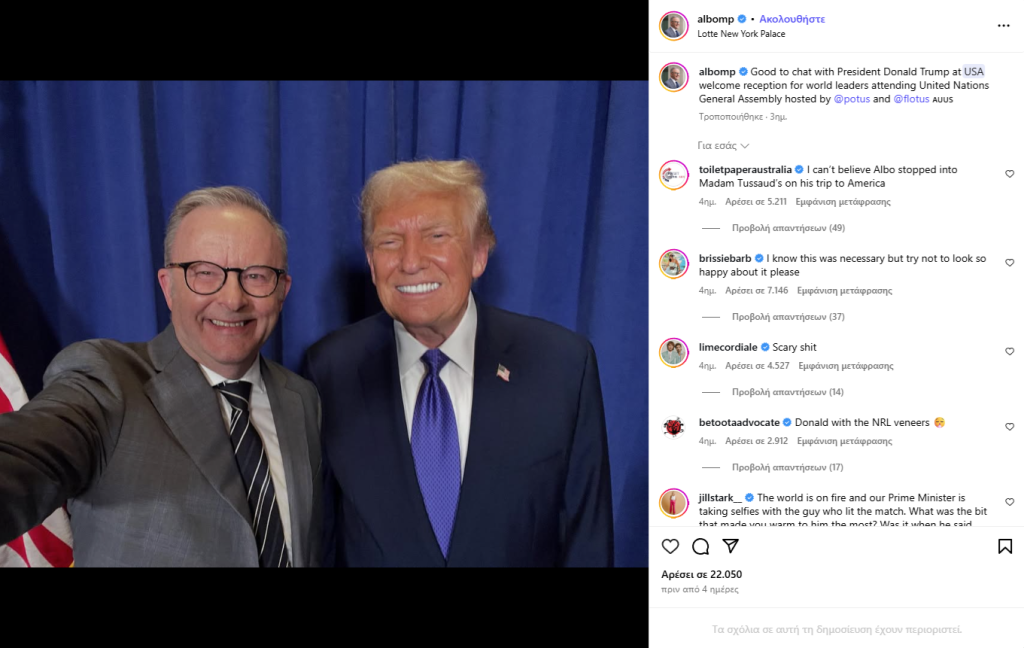 Όπως μεταδίδει ο Guardian, κατά τη διάρκεια της επίσημης φωτογράφησης, ο πρωθυπουργός της Αυστραλίας, Anthony Albanese, τράβηξε selfie με τον ίδιο και τον Ντόναλντ Τράμπ, την οποία στη συνέχεια ανέβασε στον λογαριασμό του στο Instagram: