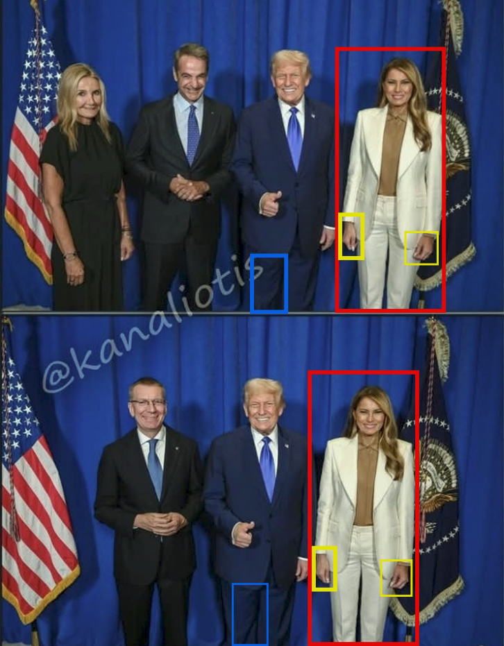 Παράδειγμα 1: Εμφανείς διαφορές στο τσάκισμα του παντελονιού του Ντόναλντ Τραμπ (με μπλε επισήμανση), στη γενικότερη στάση σώματος της Μελάνια Τραμπ (με κόκκινη επισήμανση) και στα χέρια της Μελάνια Τραμπ (με κίτρινη επισήμανση):