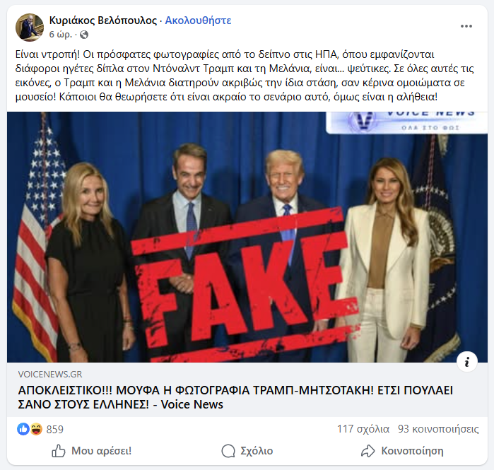 Τον υπό εξέταση ισχυρισμό διέδωσε επίσης ο πρόεδρος της Ελληνικής Λύσης, Κυριάκος Βελόπουλος, μέσω ανάρτησης στη σελίδα του στο Facebook:
