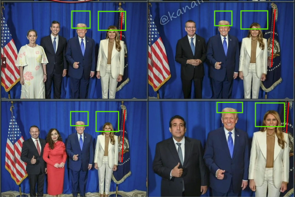 Όπως μπορείτε να δείτε στα παρακάτω παραδείγματα, οι Ντόναλντ και Μελάνια Τραμπ αλλάζουν θέση σε κάθε φωτογραφία με αποτέλεσμα να βρίσκονται σε διαφορετική θέση ως προς την κουρτίνα του παρασκηνίου (επισημασμένη στις λεπτομέρειες με πράσινο χρώμα) και τη σημαία, ενώ το κορδόνι της σημαίας (επισημασμένο με κόκκινο χρώμα) εμφανίζεται είτε ολόκληρο στο πλάι της Μελάνια Τραμπ, είτε τμηματικά πίσω της: