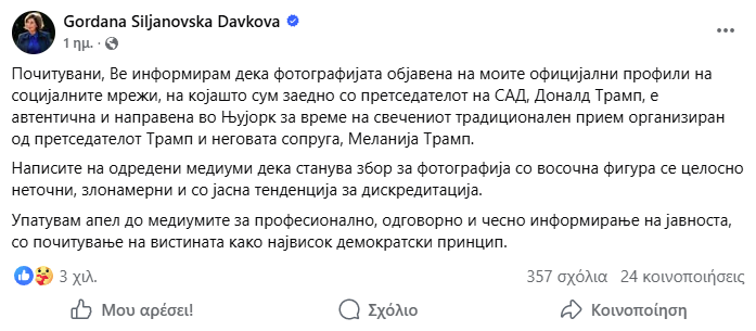 Αγαπητοί μου, θα ήθελα να σας ενημερώσω ότι η φωτογραφία που δημοσιεύτηκε στα επίσημα προφίλ μου στα μέσα κοινωνικής δικτύωσης, στην οποία βρίσκομαι μαζί με τον Πρόεδρο των Ηνωμένων Πολιτειών, Ντόναλντ Τραμπ, είναι αυθεντική και τραβήχτηκε στη Νέα Υόρκη κατά τη διάρκεια της τελετής παραδοσιακής δεξίωσης που διοργάνωσε ο Πρόεδρος Τραμπ και η σύζυγός του, Μελάνια Τραμπ.