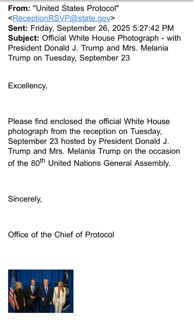 Τέλος, στη δημοσιότητα δόθηκε και το επίσημο e-mail που εστάλη στην Ελληνική Κυβέρνηση, όπως και σε όλους τους αρχηγούς κρατών που φωτογραφήθηκαν με το ζεύγος Τραμπ, με συνημμένη τη φωτογραφία του πρωθυπουργικού ζεύγους με τον Ντόναλντ και τη Μελάνια Τραμπ: