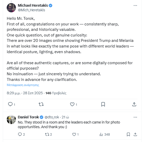 Υπάρχουν πάνω από 20 εικόνες στο διαδίκτυο που δείχνουν τον Πρόεδρο Τραμπ και τη Μελάνια σε αυτό που μοιάζει ακριβώς με την ίδια πόζα με διαφορετικούς παγκόσμιους ηγέτες — ίδια στάση, φωτισμό, ακόμη και σκιές.