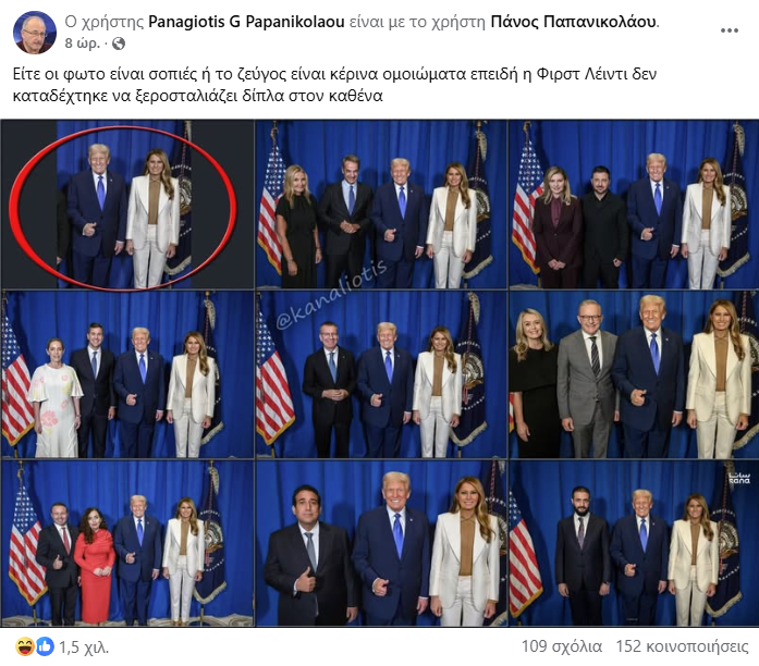 Στο πλαίσιο των υπό εξέταση ισχυρισμών, διακινείται κολάζ φωτογραφιών το οποίο περιέχει οκτώ φωτογραφίες του ζεύγους Τραμπ με ηγέτες κρατών, ανάμεσα τους και ο πρωθυπουργός της Ελλάδας: