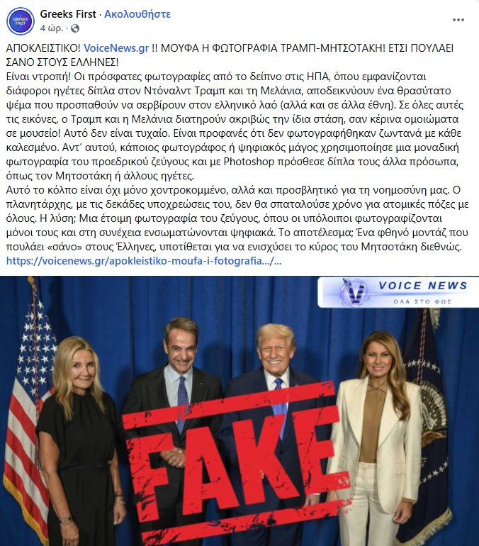 Είναι σημαντικό να αναφέρουμε πως, εικόνα που διακινείται μέσω κοινωνικών δικτύων και υποτίθεται πως δείχνει το ζεύγος Τράμπ να έχει φωτογραφηθεί μόνο του, είναι στην πραγματικότητα κατασκευασμένη μέσω τεχνητής νοημοσύνης. Η εν λόγω εικόνα φέρει το λογότυπο του ψηφιακού βοηθού Τεχνητής Νοημοσύνης και εργαλείου επεξεργασίας εικόνων Google Gemini. Όπως φαίνεται στις παρακάτω εικόνες, αυτή τοποθετείται αυτόματα σε κάθε φωτογραφία που κατασκευάζεται ή επεξεργάζεται μέσω του εργαλείου τεχνητής νοημοσύνης: