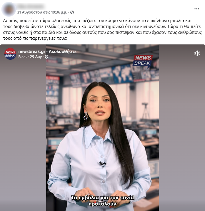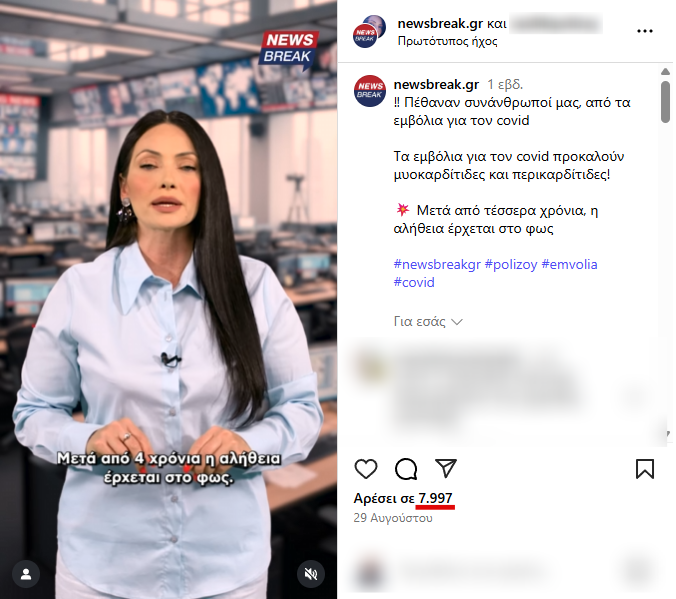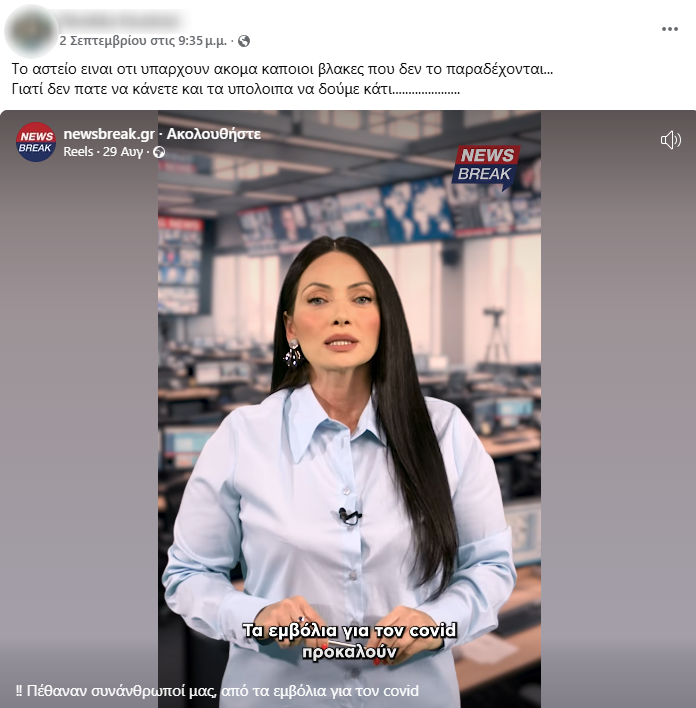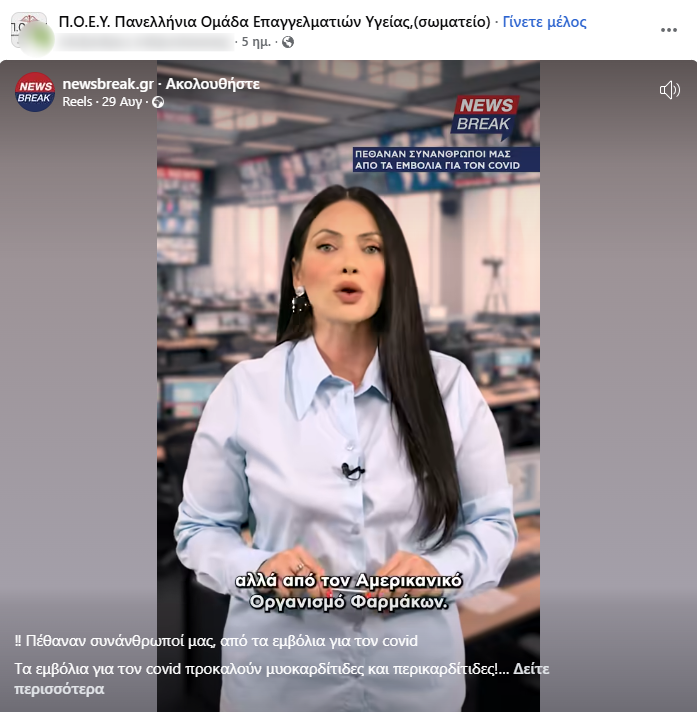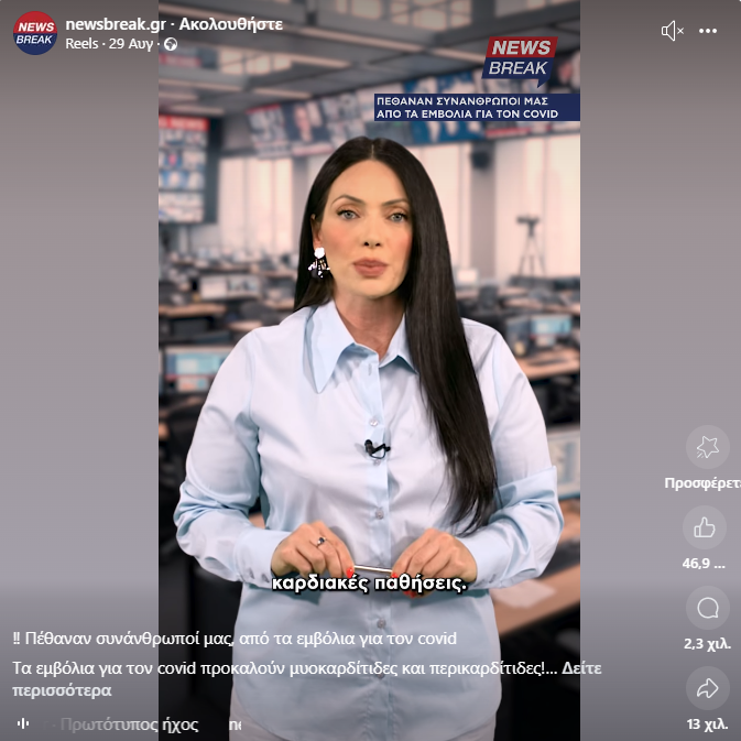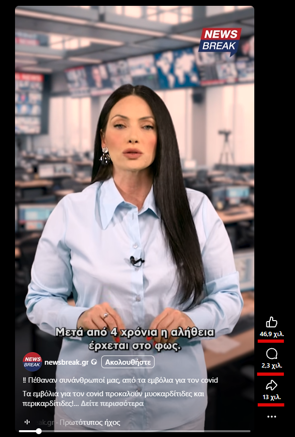 Ταυτόχρονα, στην περιγραφή του βίντεο, αλλά και σε γραφικό στο ίδιο το βίντεο, εμφανίζεται το κείμενο «ΠΕΘΑΝΑΝ ΣΥΝΑΝΘΡΩΠΟΙ ΜΑΣ ΑΠΟ ΤΑ ΕΜΒΟΛΙΑ ΓΙΑ ΤΟΝ COVID».
