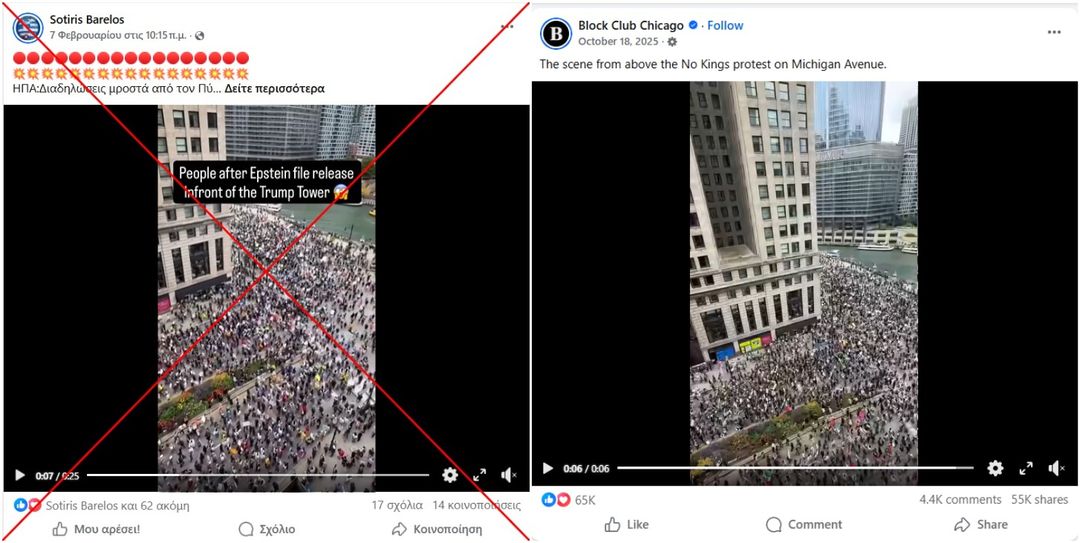 «Άνθρωποι μετά τη δημοσιοποίηση των αρχείων Έπσταϊν μπροστά στον Πύργο Τραμπ», γράφει μια αγγλική λεζάντα σε ένα βίντεο που κοινοποιήθηκε σε μια μακροσκελή ελληνική ανάρτηση στις 8 Φεβρουαρίου 2026.