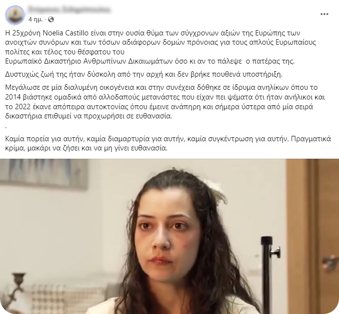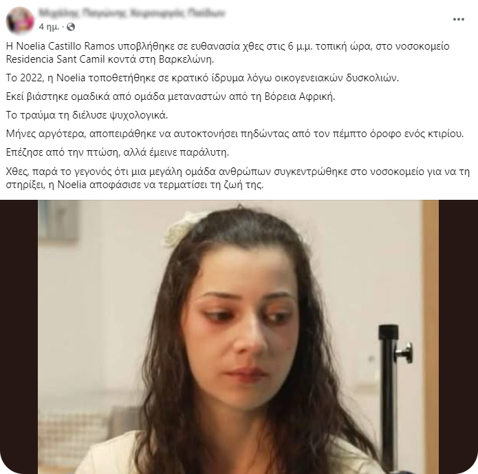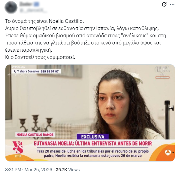 Η Nοέλια Καστίγιο, μια 25χρονη παραπληγική γυναίκα από την Ισπανία, υποβλήθηκε στις 26 Μαρτίου 2026 σε εκούσια ευθανασία, με την υπόθεσή της να γίνεται ευρέως γνωστή έπειτα από τηλεοπτική συνέντευξη που παραχώρησε σε ισπανικό δίκτυο, μιλώντας ανοιχτά για σοβαρές τραυματικές εμπειρίες που είχε βιώσει. [Πηγή]