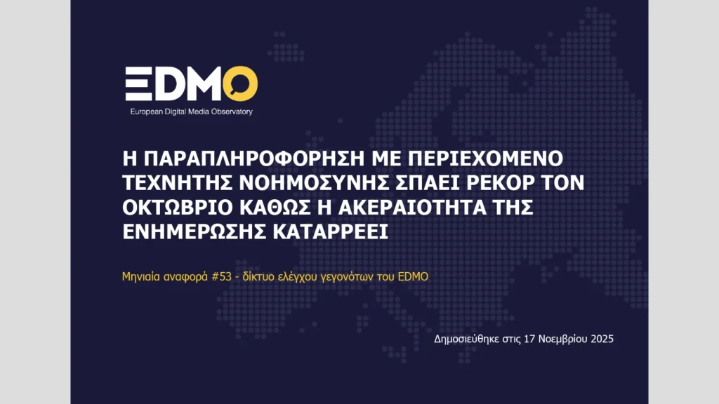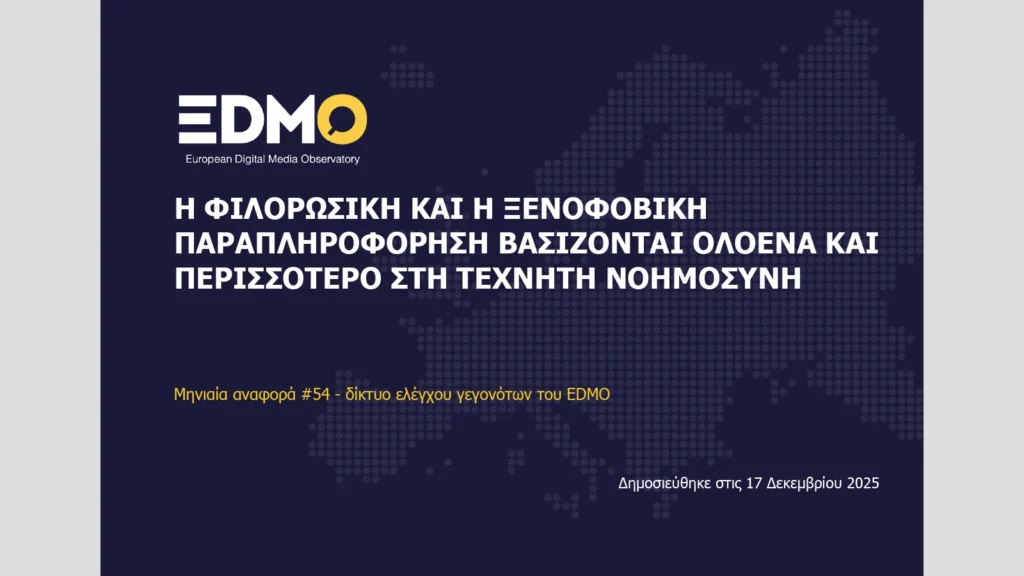Το fact-checking brief του Νοεμβρίου του EDMO αναδεικνύει μια σαφή μετατόπιση στον τρόπο με τον οποίο παράγεται και διαδίδεται η παραπληροφόρηση. Φιλορωσικά και ξενοφοβικά αφηγήματα ενισχύονται όλο και περισσότερο μέσω εργαλείων generative AI, καθιστώντας το ψευδές περιεχόμενο ευκολότερο στην παραγωγή, ταχύτερο στη διάδοση και συχνά πιο πειστικό.