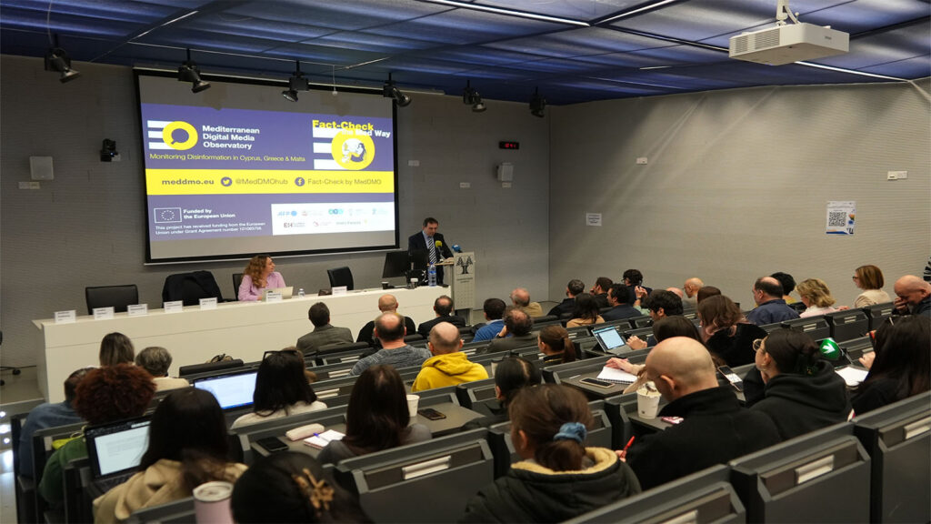 Η διαδικτυακή παραπληροφόρηση και οι τρόποι εξουδετέρωσής της τέθηκαν στο επίκεντρο του δεύτερου open event του MedDMO που πραγματοποιήθηκε στις 26 Φεβρουαρίου στο Κέντρο Πληροφόρησης – Βιβλιοθήκη «Στέλιος Ιωάννου» του Πανεπιστημίου Κύπρου, στη Λευκωσία.