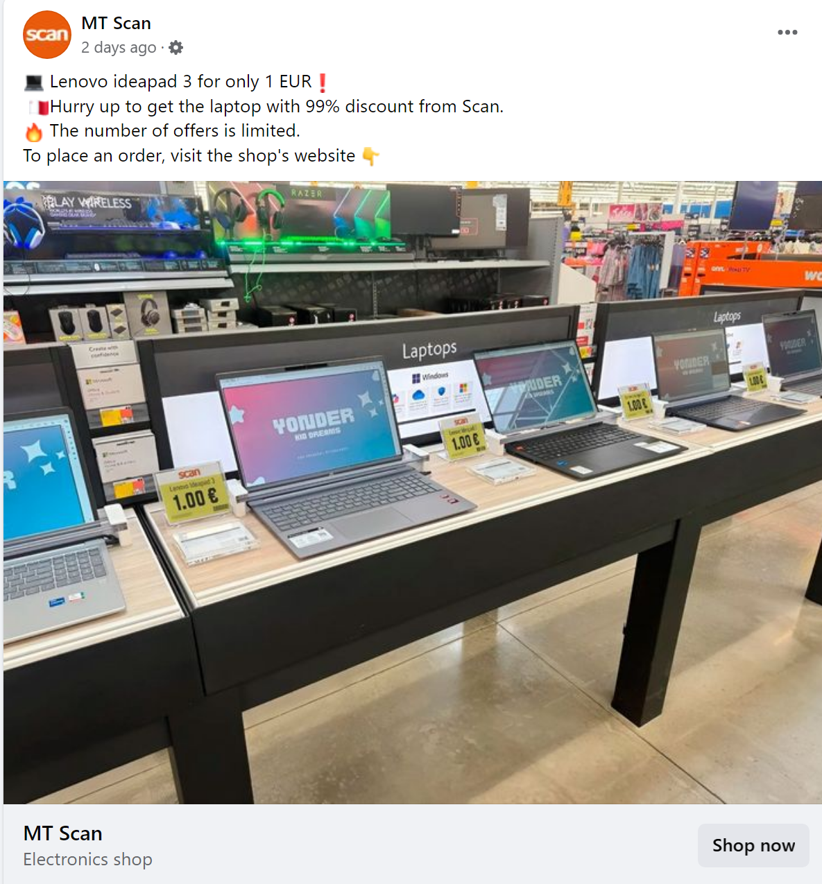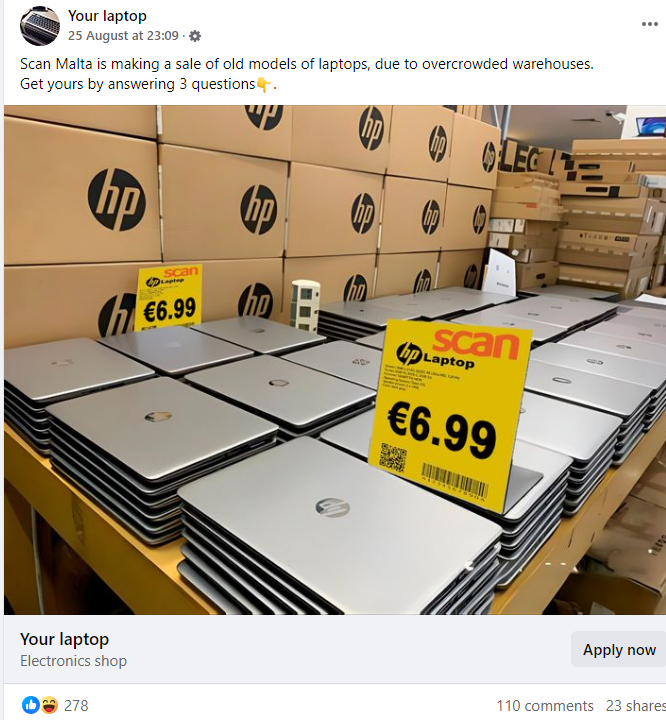 Facebook was inundated in recent days with adverts showing local electronics shop Scan – one of the best-known shops of its kind in Malta – selling laptops, tablets and other devices for just a handful of euros.