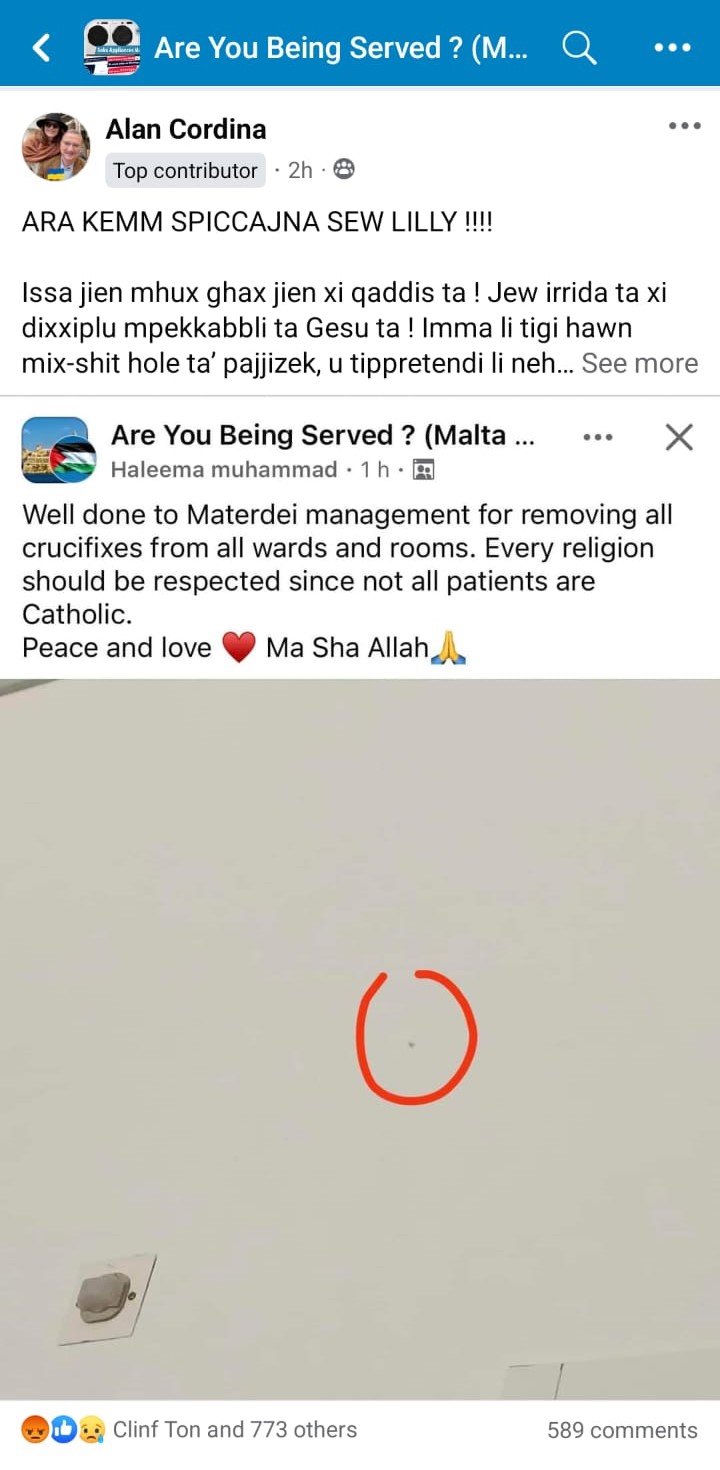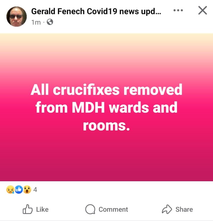 On Sunday 28 July, several Facebook users shared posts claiming that Mater Dei Hospital, Malta’s national hospital, was removing all crucifixes from its walls. As expected, some blamed this on foreigners, a reaction perhaps made worse by the fact that one post making the claim purported to be by a person of Arab descent.