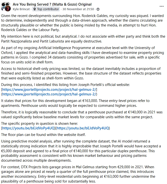 One citizen, Kyle Brincat, took to AI to compare the price Galdes paid to listings across 34 datasets, before posting his findings on Facebook group Are You Being Served?