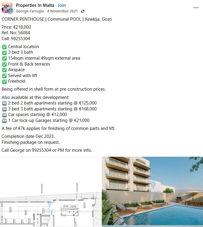A May 2021 listing for a three-bedroom penthouse in Xewkija with the use of a communal pool shows it for sale at €250,000, with the option of a garage for a further €27,000.