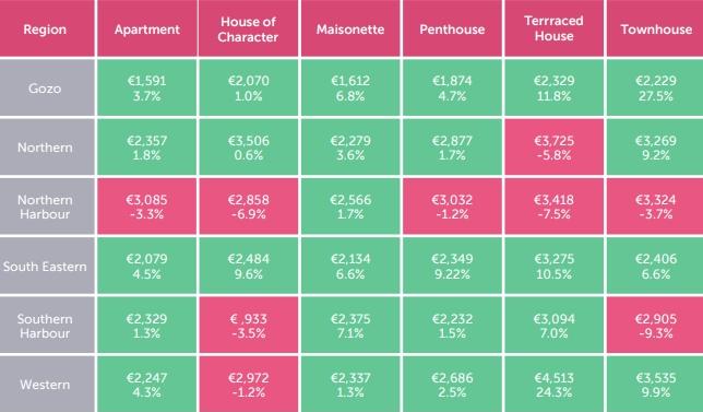 A penthouse in Gozo cost an average of €1,851 per square metre in early 2021, EY reported. By the end of the same year, this had inched upwards to €1,874 per square metre.