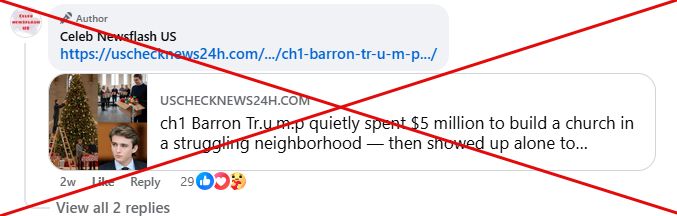 Another Facebook post tells a nearly identical story, but claims the charitable act traces to Trump’s son, Barron. It encourages users to read the “full story” linked in the comment section.
